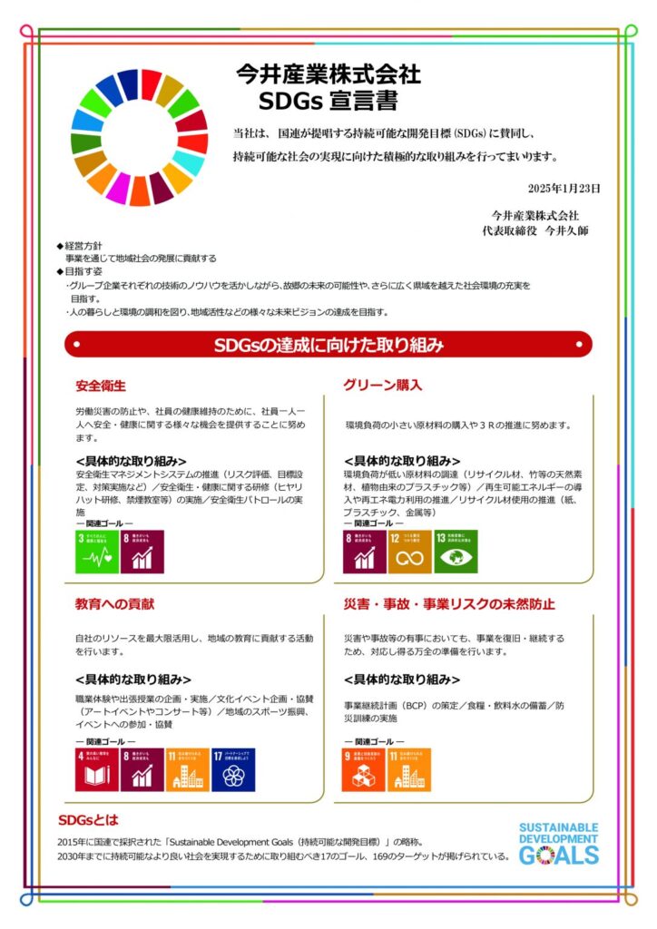 このたび今井産業は、これまでのSDGs達成にむけた取り組みを整理し、これを積極的に推し進めていくために、「SDGs宣言書」を制定しました。